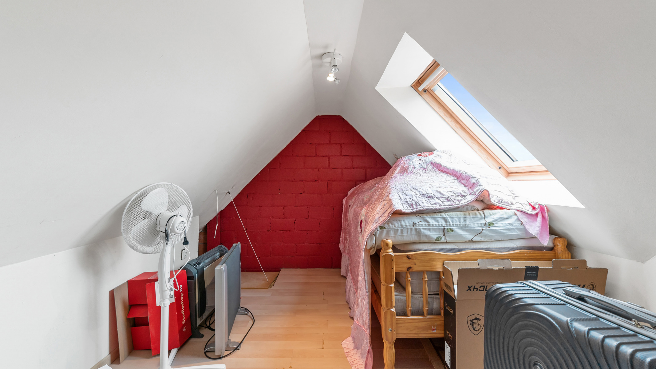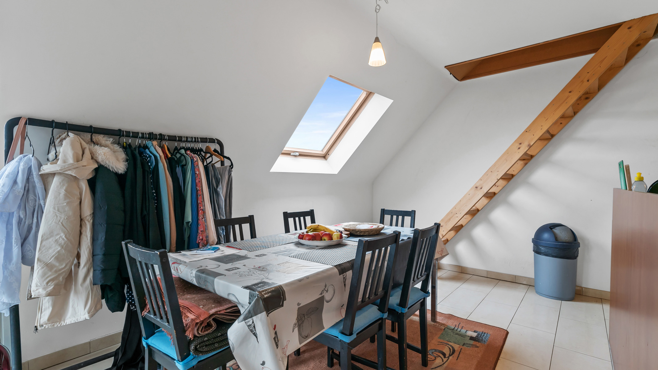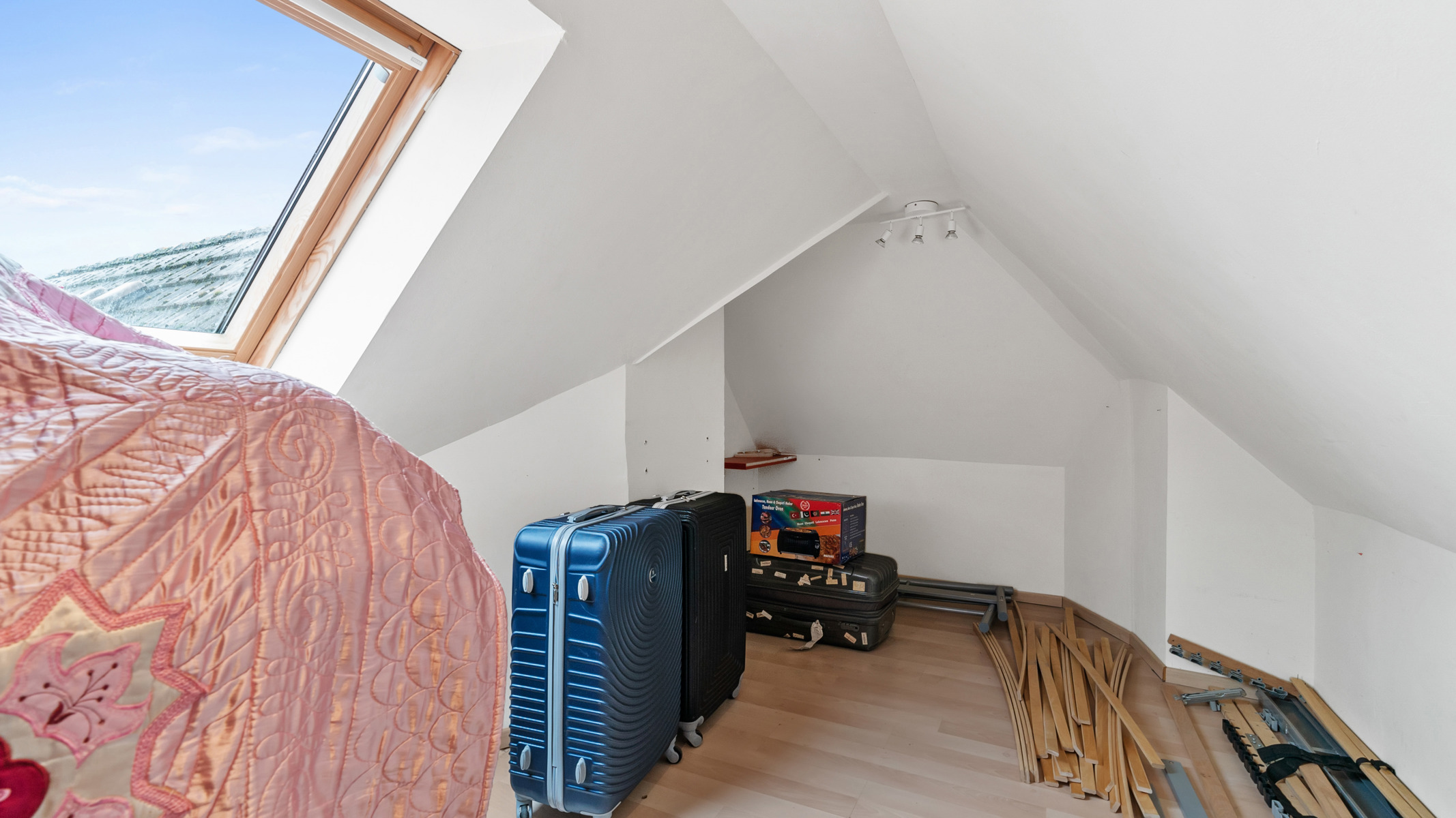 Via de trap in de woonkamer toegang naar een ruime zolderkamer.