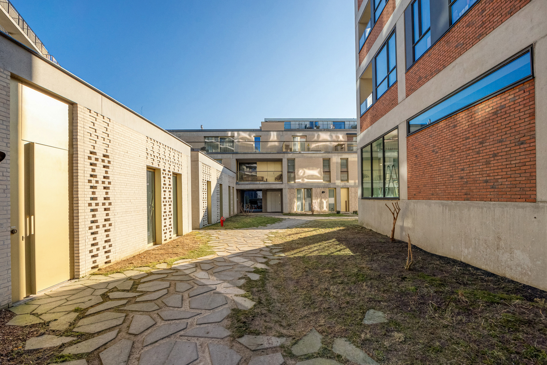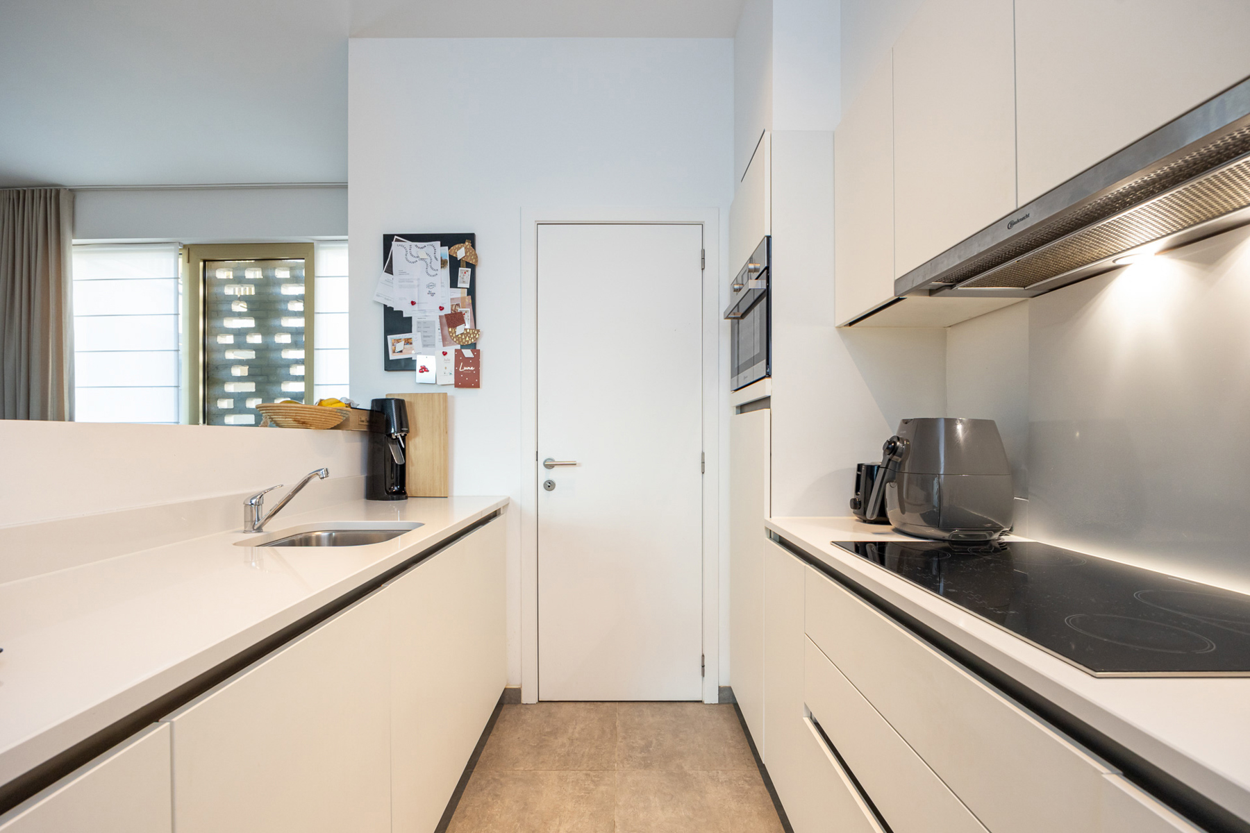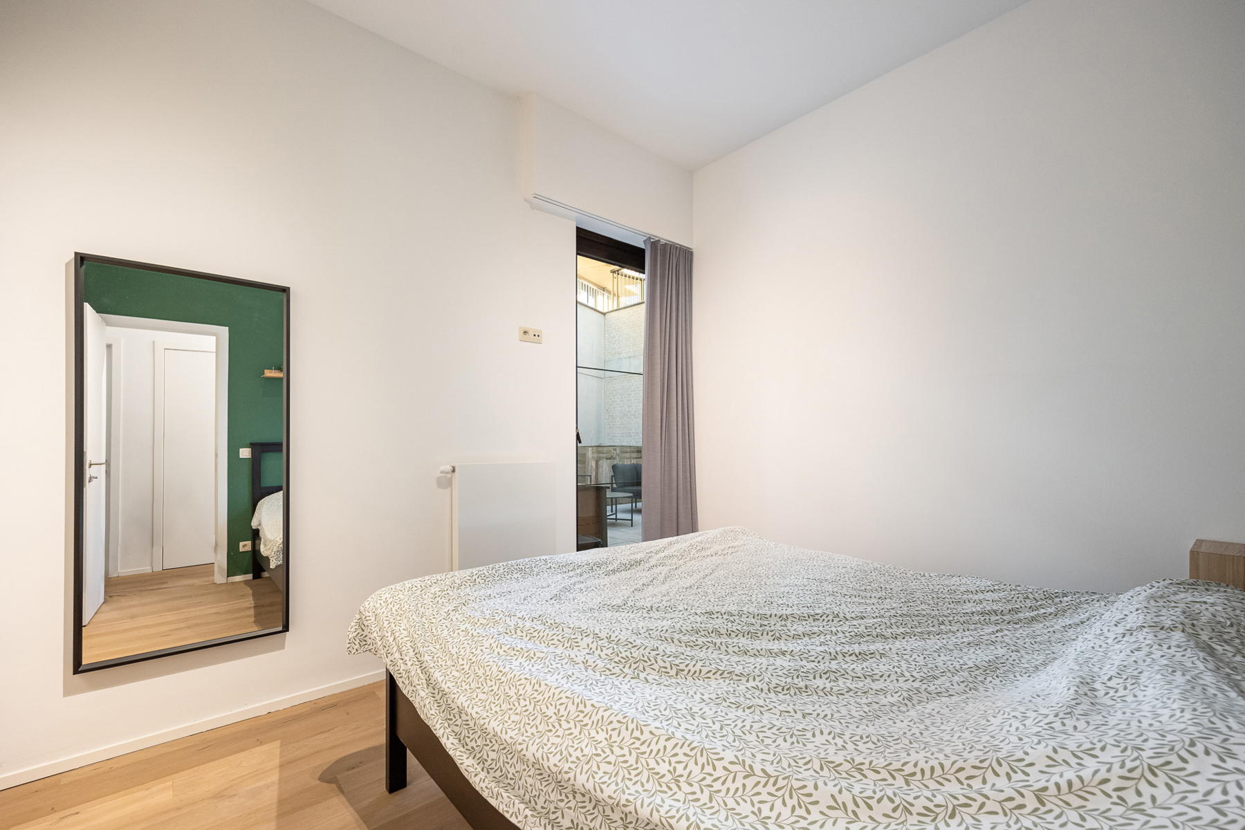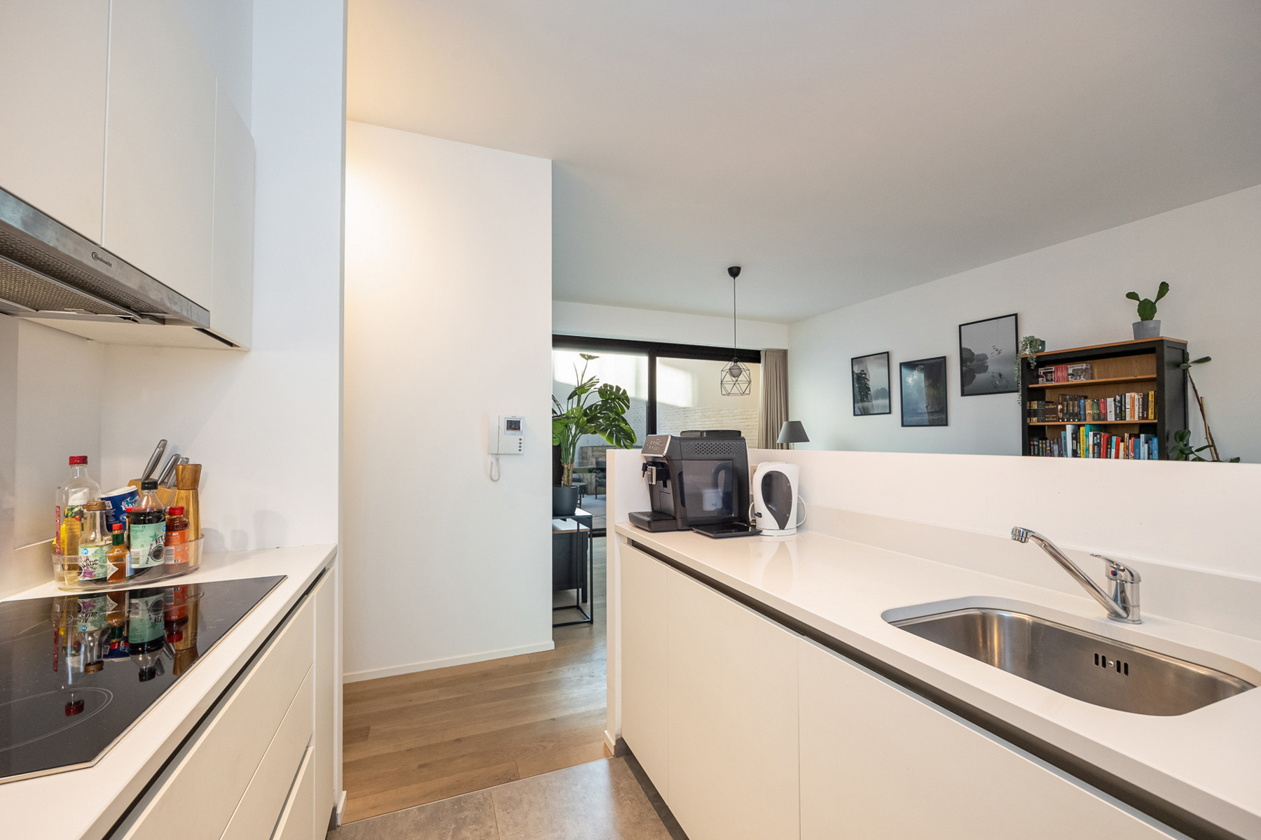 De ruime leefruimte op parket baadt in natuurlijk licht dankzij de grote schuiframen die uitgeven op een zonnige privé patio van 26 m² – de perfecte plek om te ontspannen of gasten te ontvangen. Aansluitend vindt u de volledig geïnstalleerde keuken met moderne apparatuur en een aparte berging met aansluitingen voor wasmachine en droogkast.