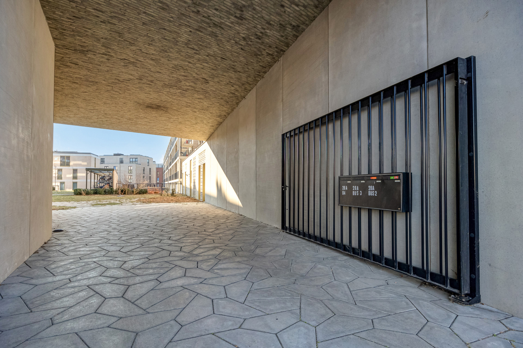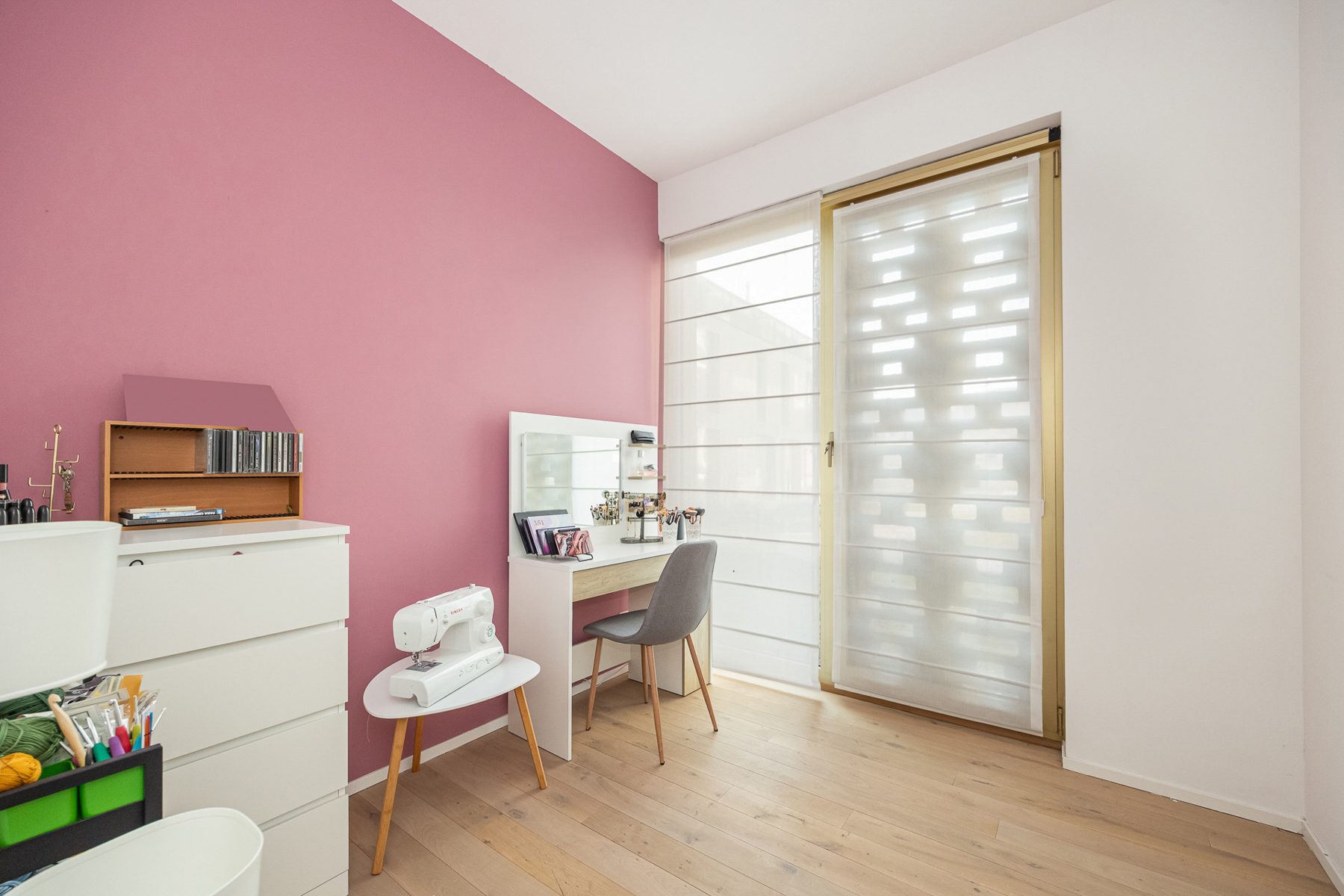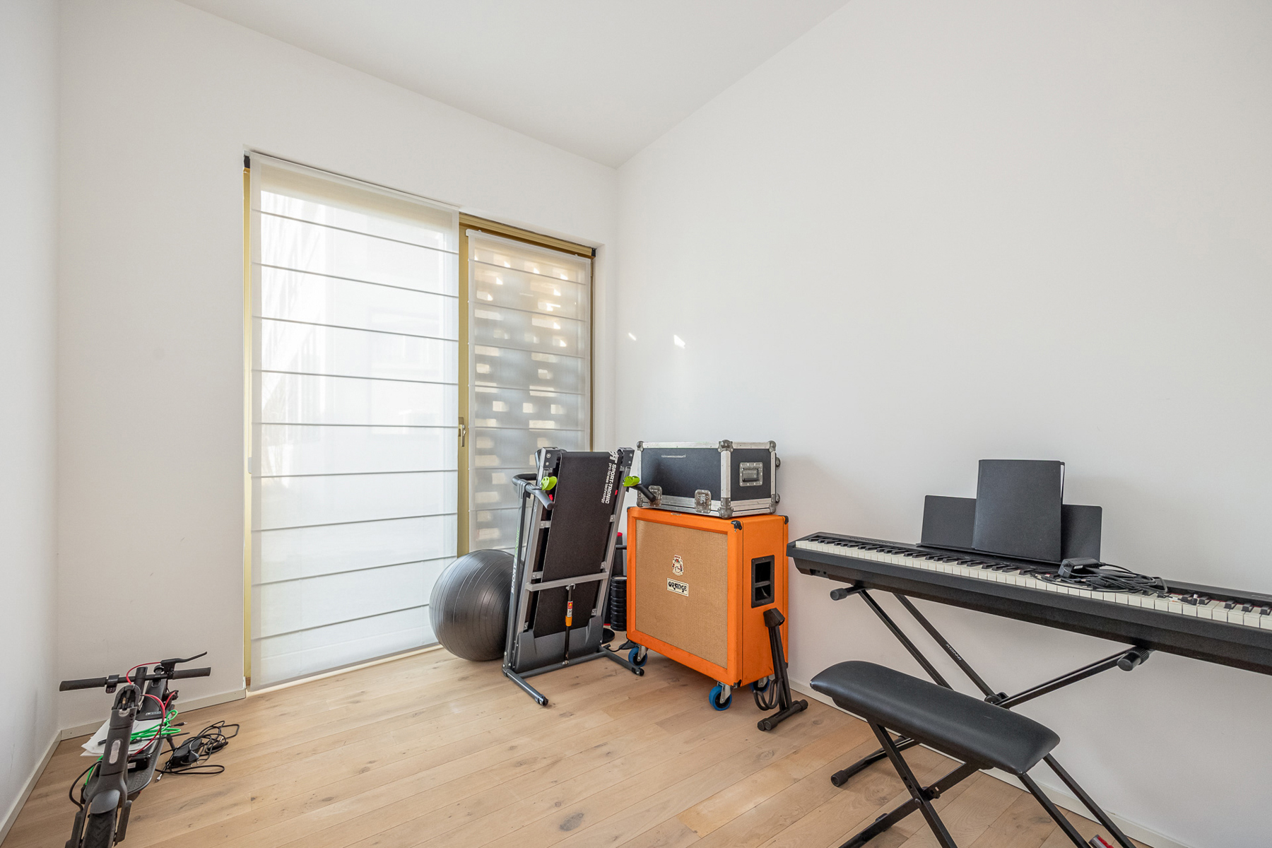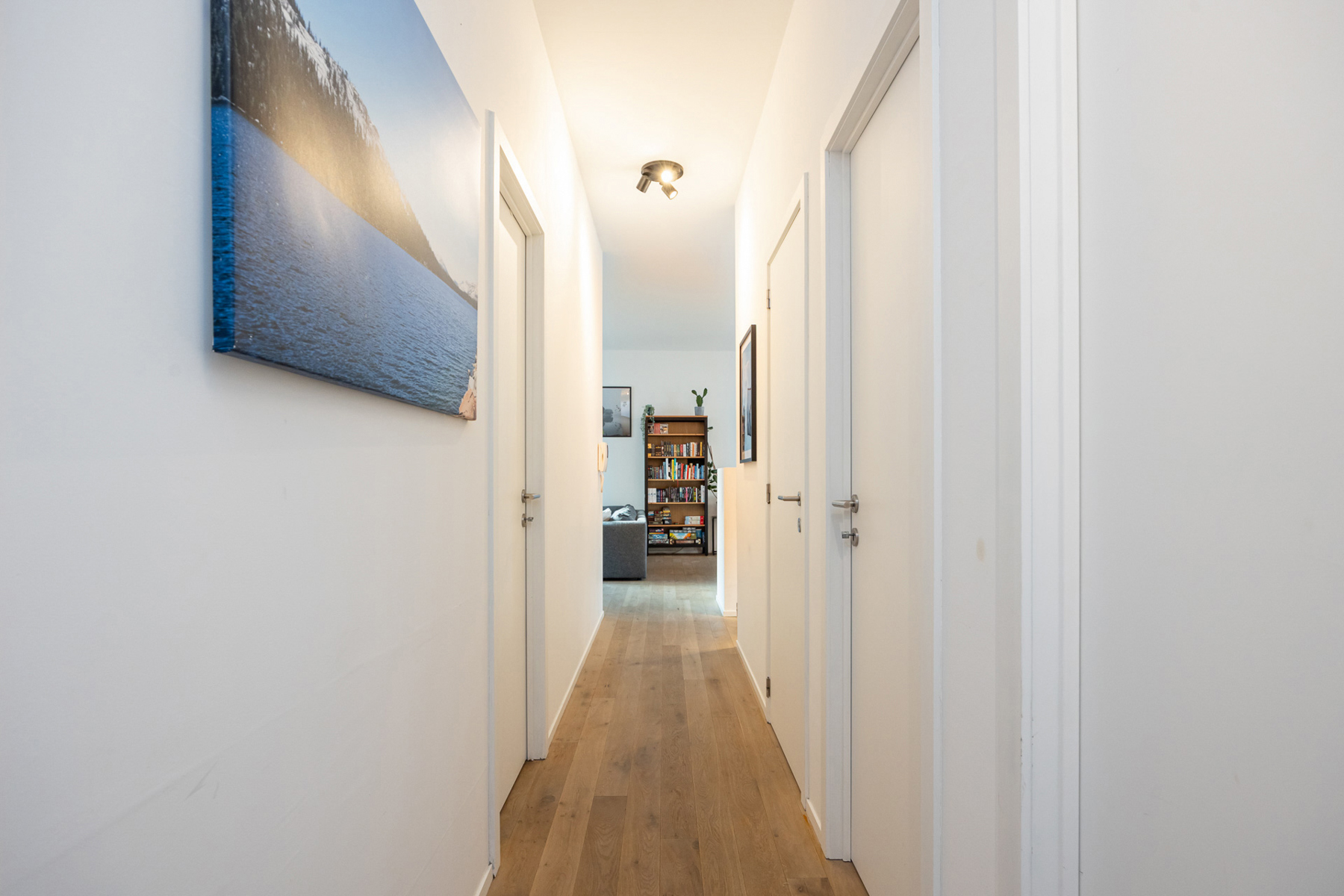 De ruime leefruimte op parket baadt in natuurlijk licht dankzij de grote schuiframen die uitgeven op een zonnige privé patio van 26 m² – de perfecte plek om te ontspannen of gasten te ontvangen. Aansluitend vindt u de volledig geïnstalleerde keuken met moderne apparatuur en een aparte berging met aansluitingen voor wasmachine en droogkast.