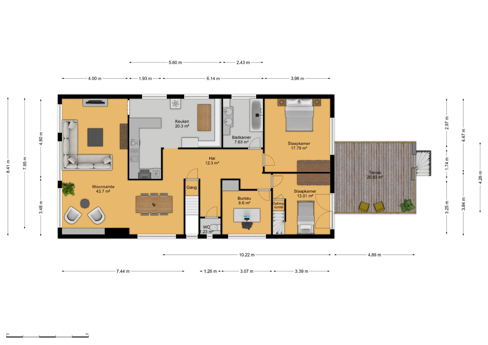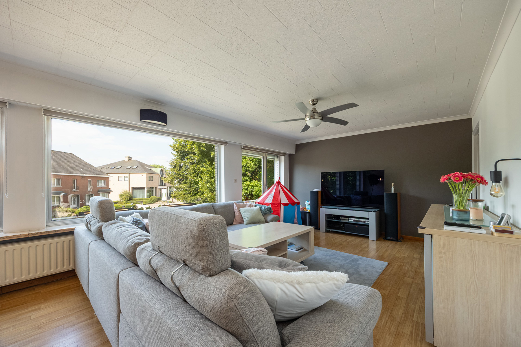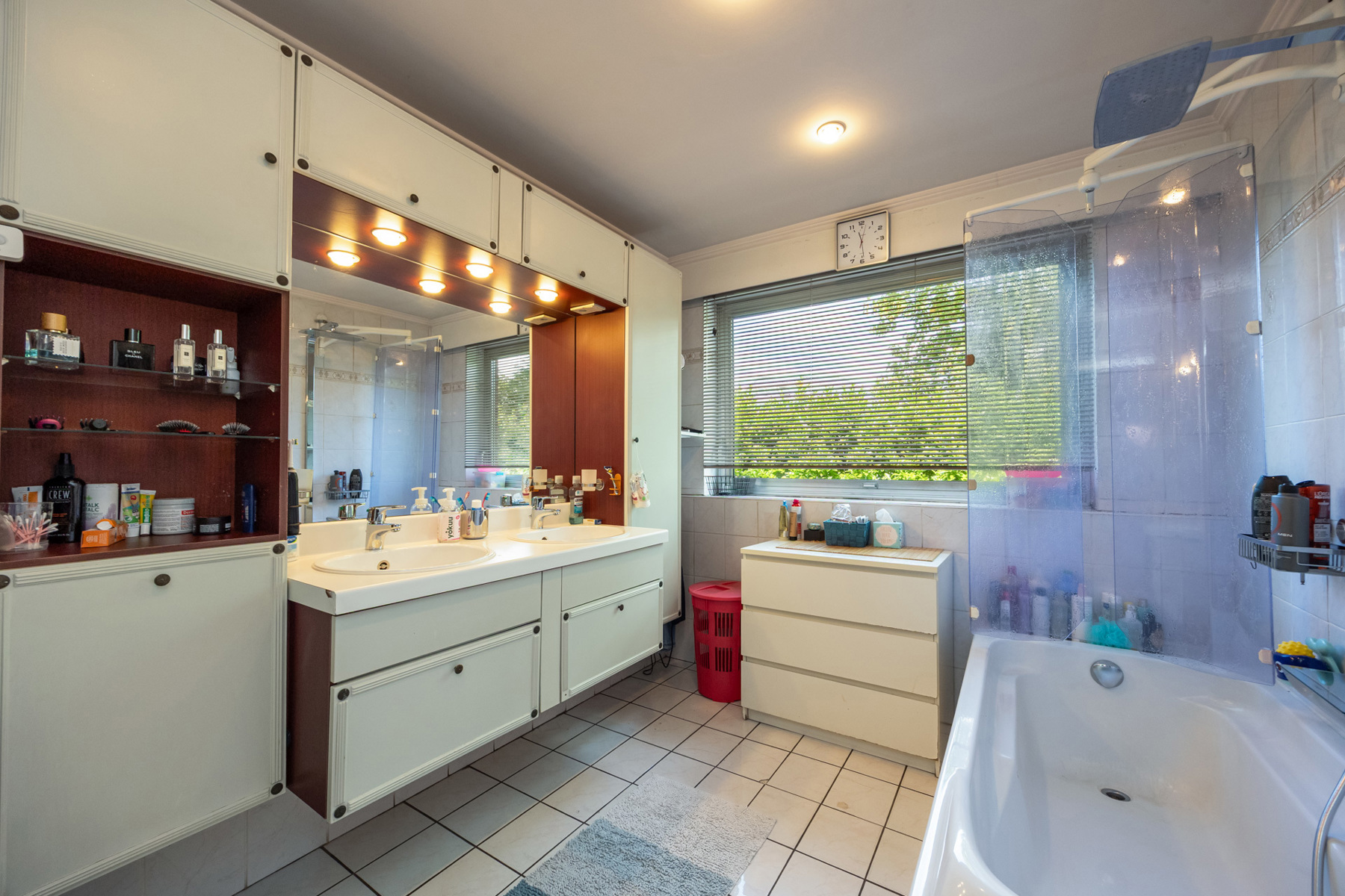 Op de eerste verdieping bevindt zich een ruime leefruimte met grote ramen en een volledig uitgeruste keuken met eethoek, drie slaapkamers, een badkamer met douche in bad en dubbele lavabo, plus een apart gastentoilet.