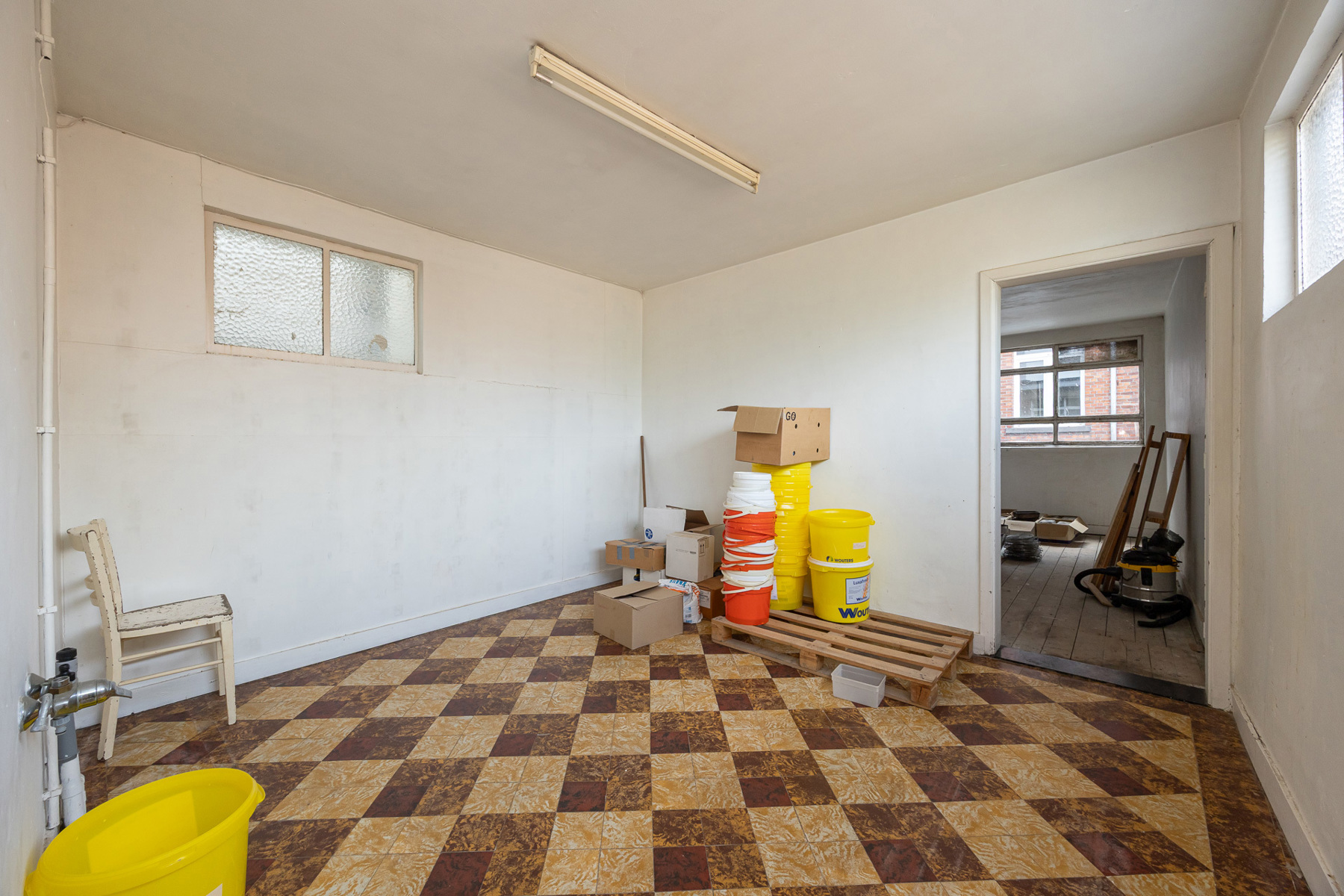 De eerste verdieping bestaat uit twee delen. Aan de achterzijde vind je een badkamer met douche, bad en lavabo, alsook twee kamers die naar wens ingericht kunnen worden. Aan de straatzijde ligt een ruime woonkamer met veel lichtinval en twee potentiële slaapkamers. Deze indeling maakt een duidelijke scheiding tussen werk en privé mogelijk.