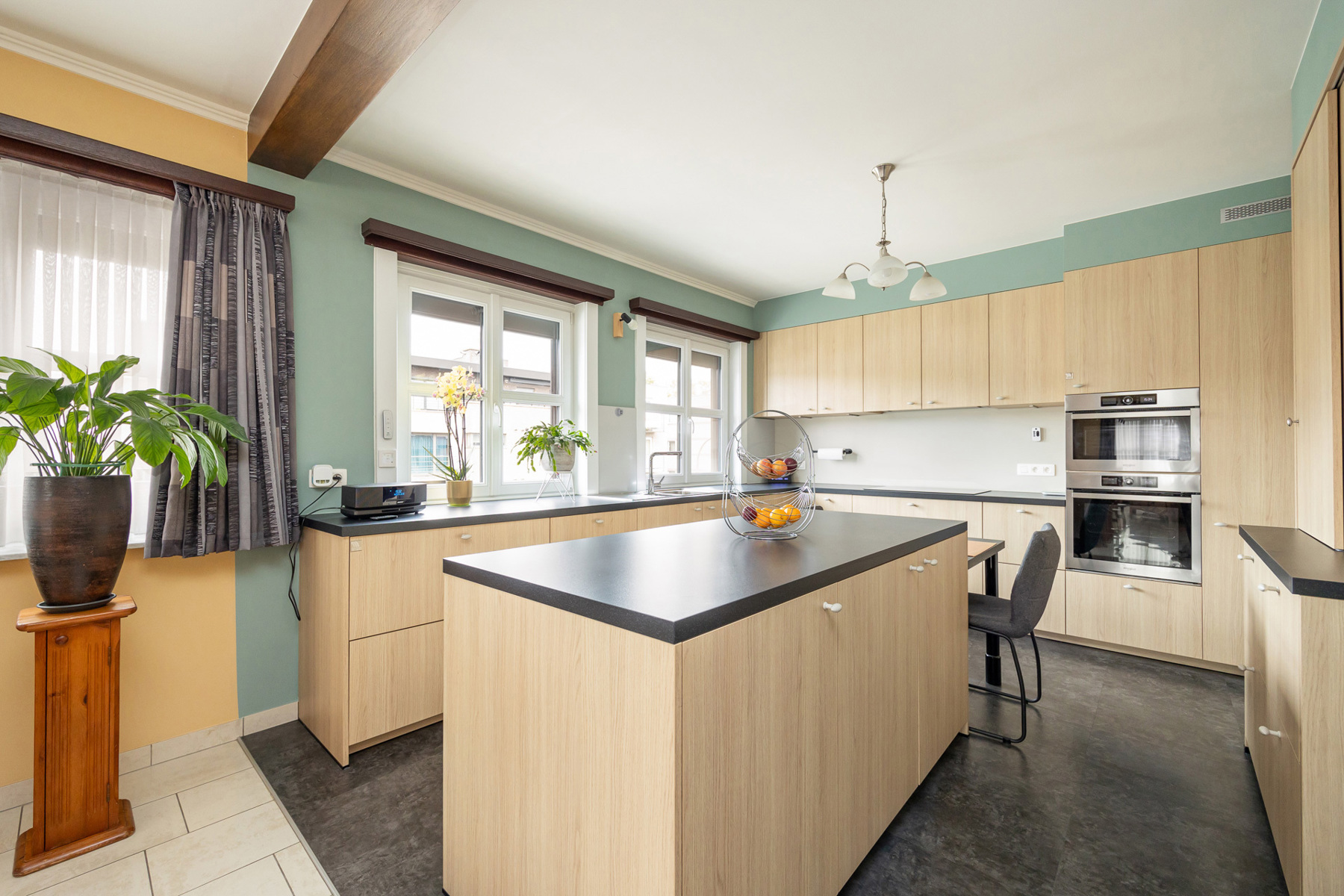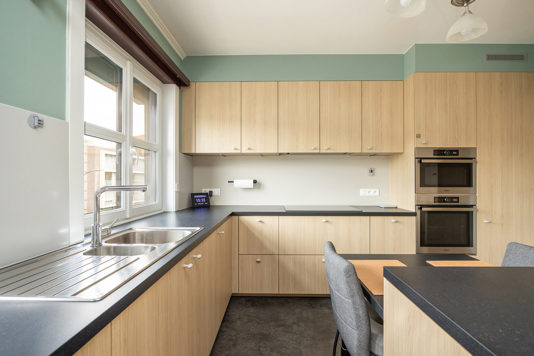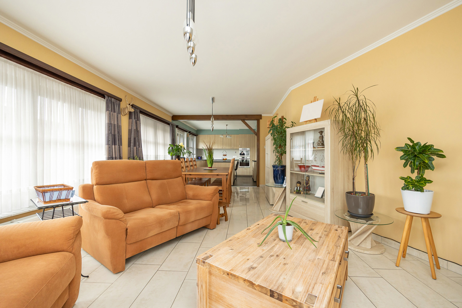 Binnenin valt meteen de ruime, lichtrijke leefruimte op met grote ramen in driedubbel veiligheidsglas die volledig open kunnen. De open keuken met kookeiland, door Keukens De Abdij (2023), is praktisch en stijlvol ingericht met kwaliteitsvolle toestellen zoals een combi-oven, oven, koelkast en vaatwasser. Een praktische berging grenst aan de keuken.