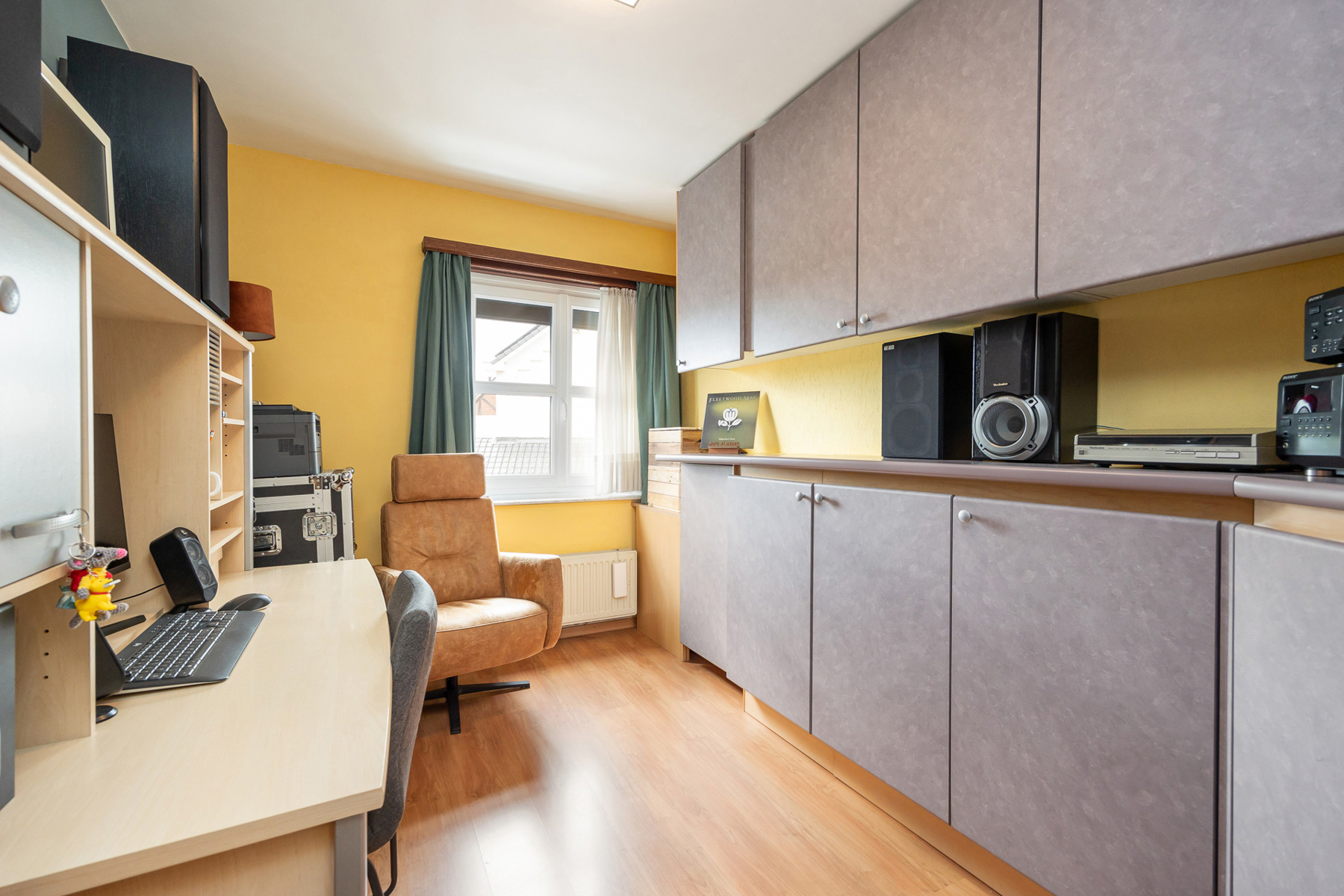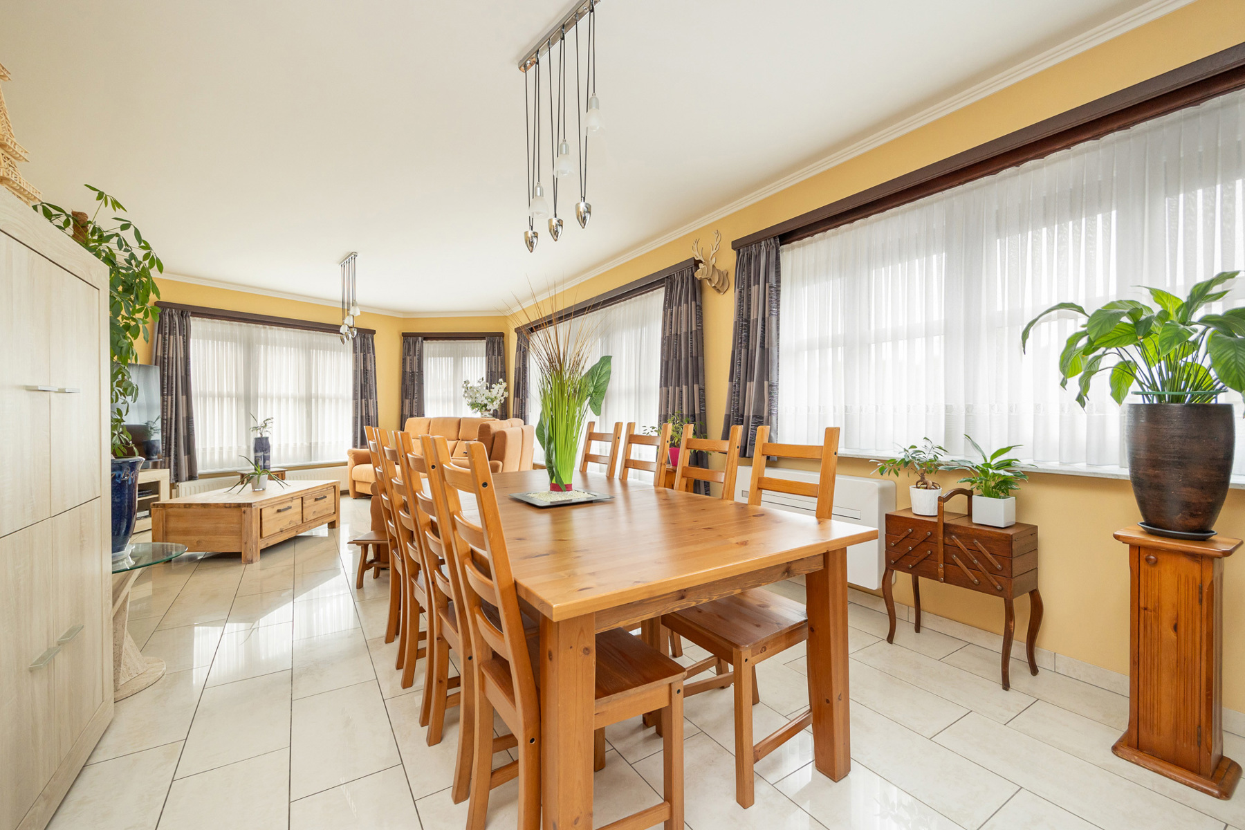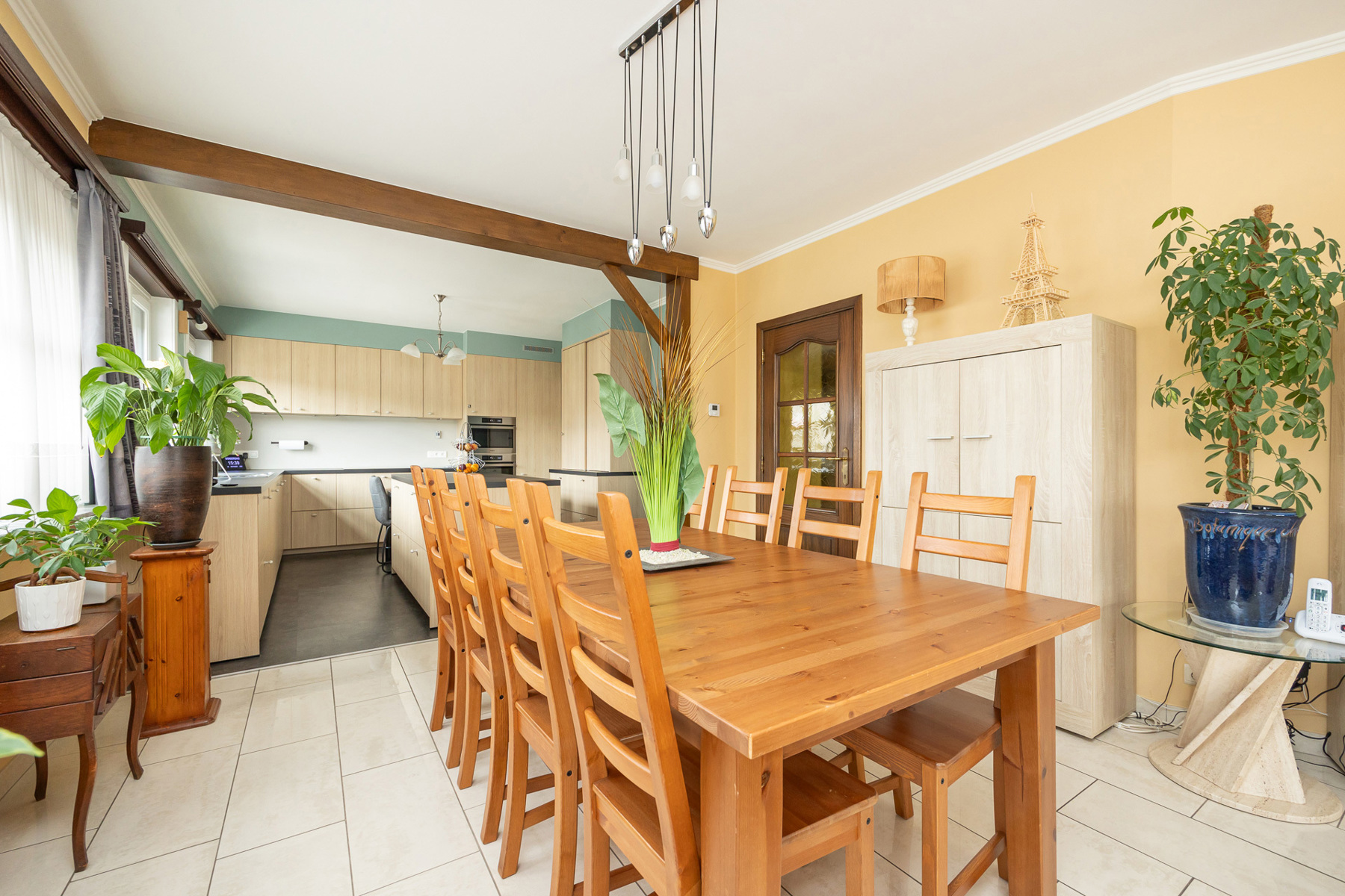 Binnenin valt meteen de ruime, lichtrijke leefruimte op met grote ramen in driedubbel veiligheidsglas die volledig open kunnen. De open keuken met kookeiland, door Keukens De Abdij (2023), is praktisch en stijlvol ingericht met kwaliteitsvolle toestellen zoals een combi-oven, oven, koelkast en vaatwasser. Een praktische berging grenst aan de keuken.
