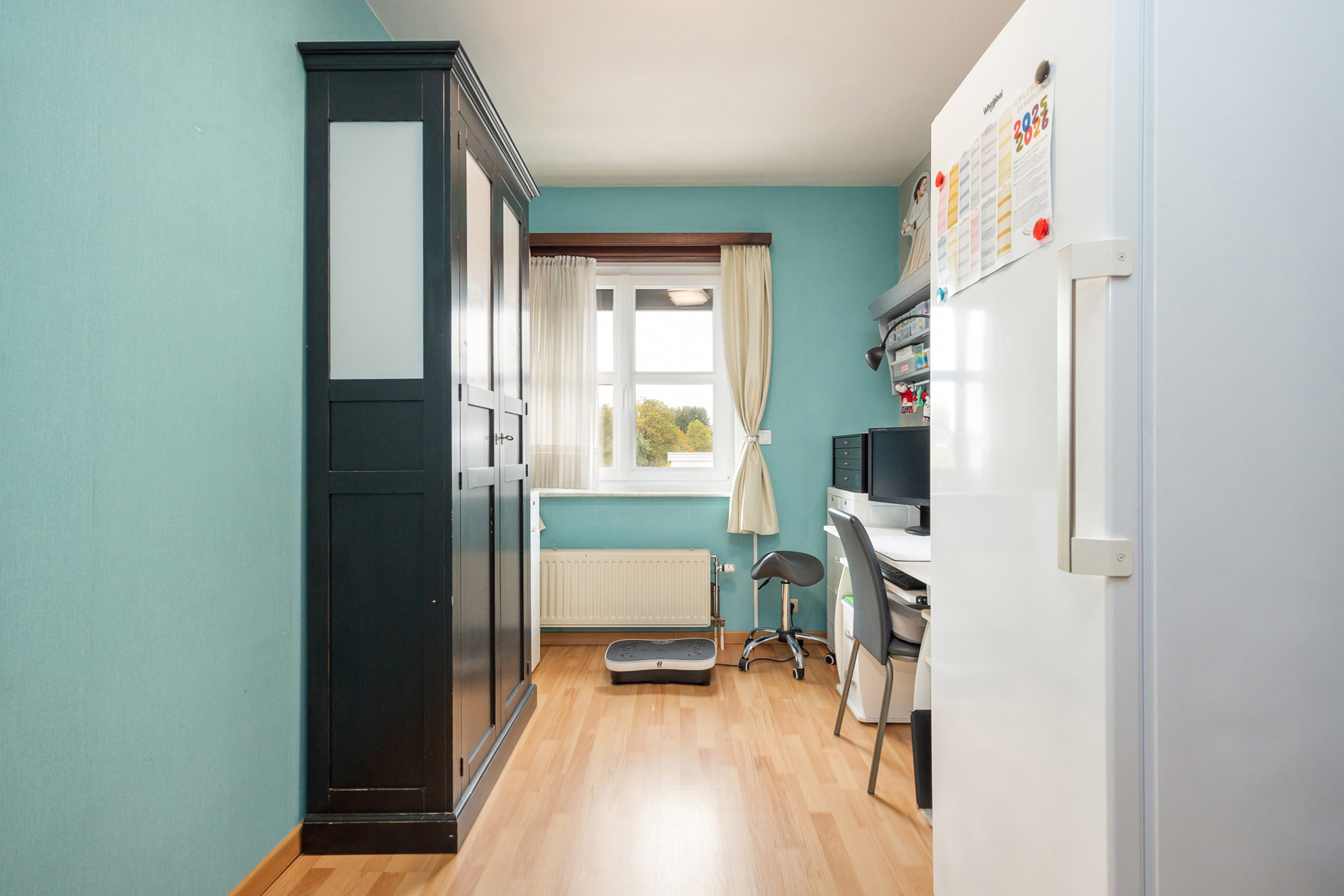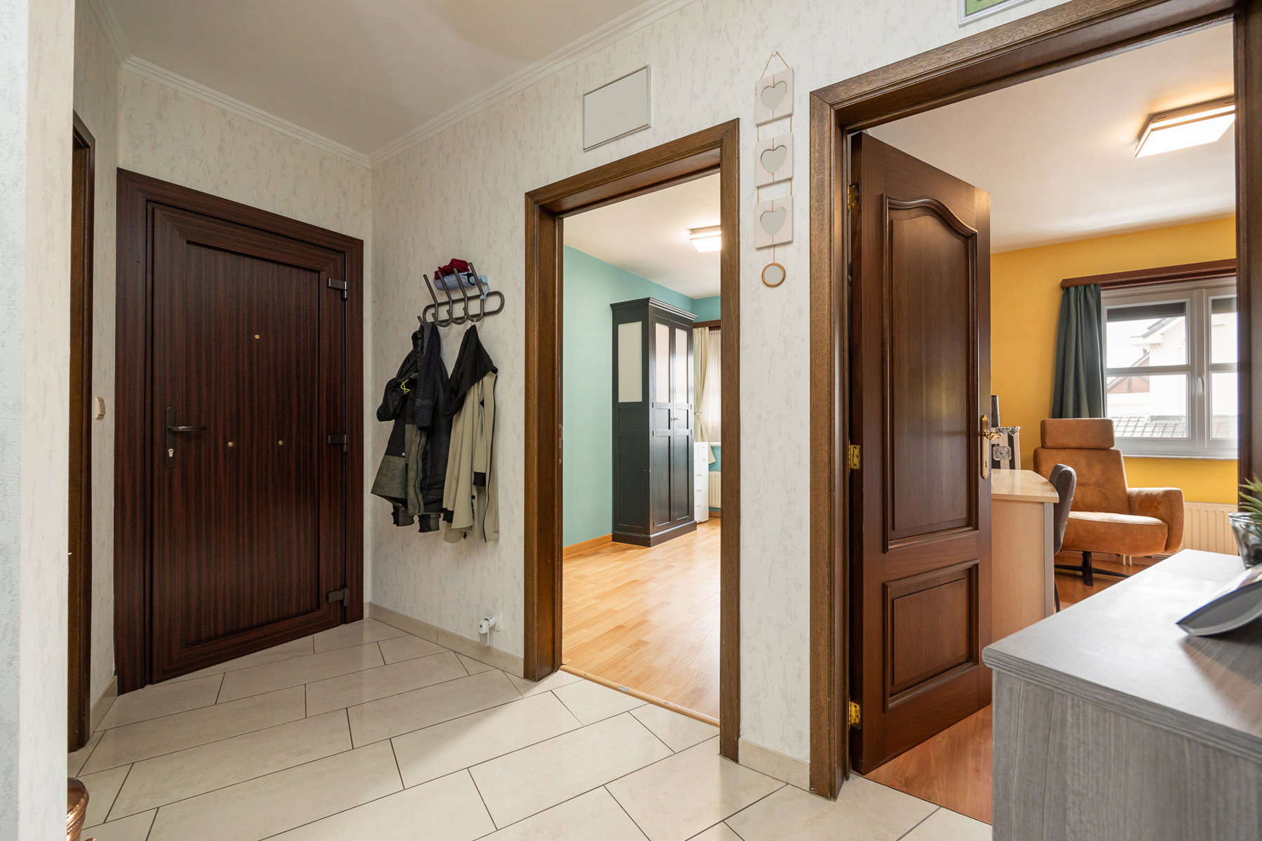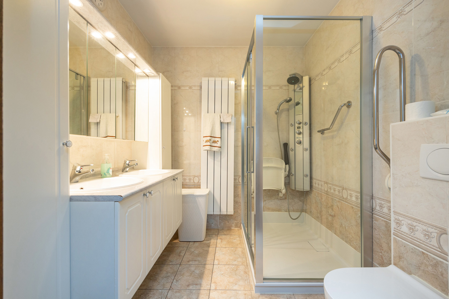 Via de ruime hal bereikt u de badkamer met douche, dubbele lavabo en toilet, alsook drie comfortabele slaapkamers. De grootste slaapkamer heeft toegang tot een terras van 6m², gericht naar het noordoosten — ideaal voor een ochtendkoffie in de zon. Verder is er nog een apart gastentoilet aanwezig.