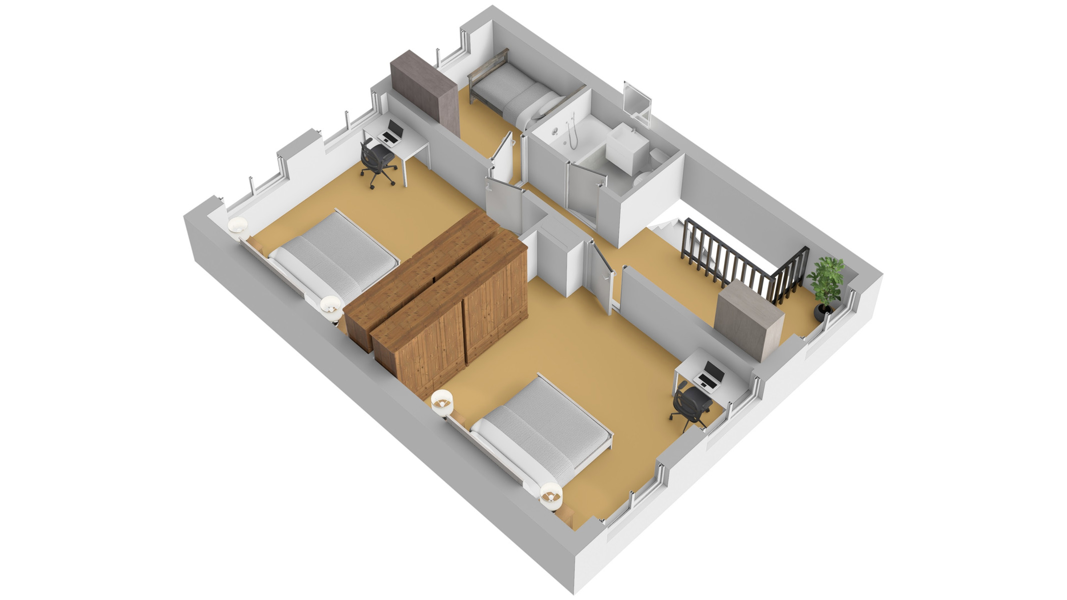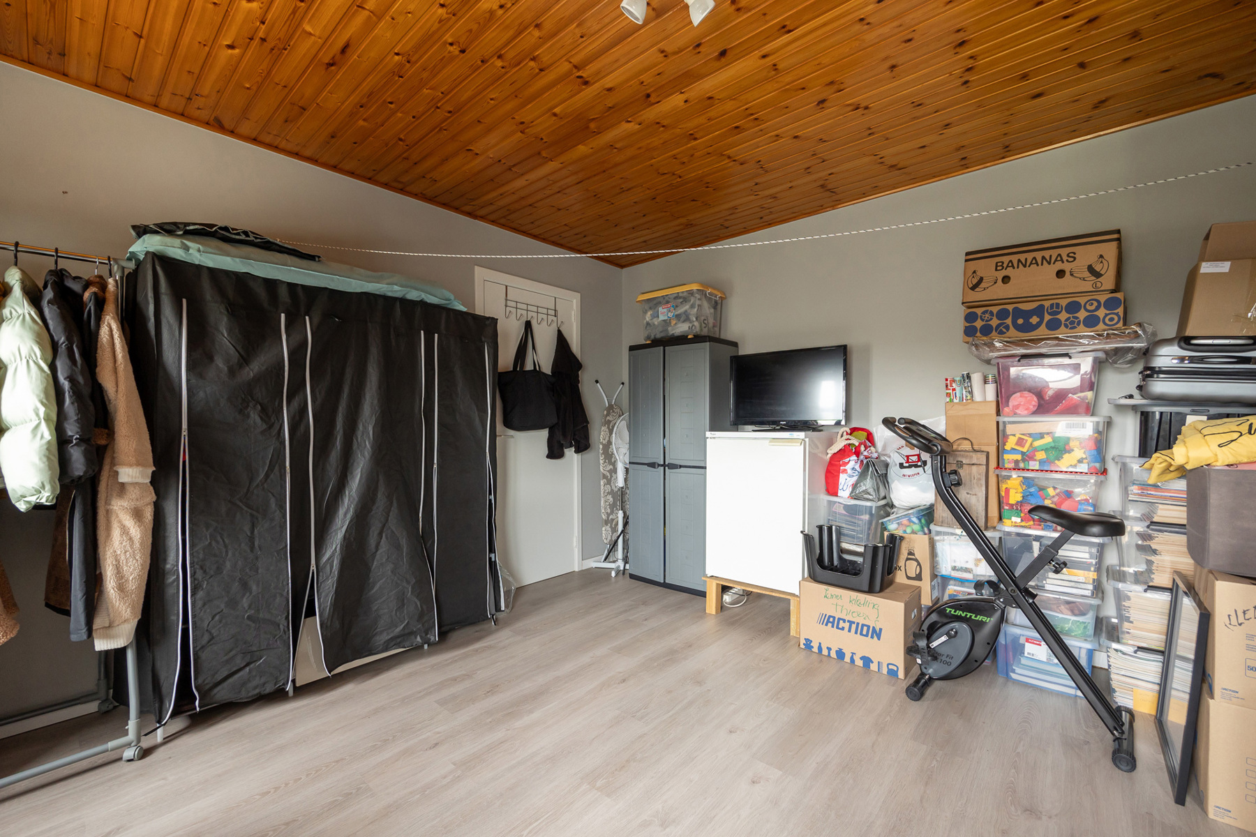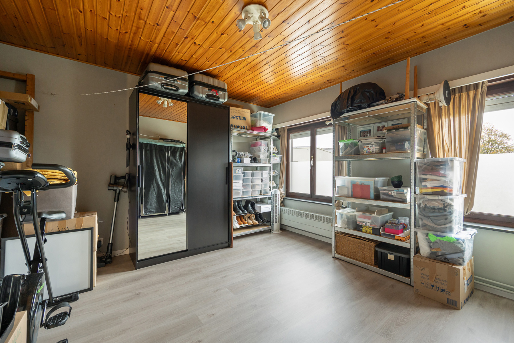 Op de verdieping bevinden zich twee ruime slaapkamers en een derde, kleinere kamer die perfect dienst kan doen als bureau of kinderkamer. De badkamer is uitgerust met een douche in bad, lavabo en toilet. De zolder biedt bijkomende bergruimte en interessante uitbreidingsmogelijkheden.