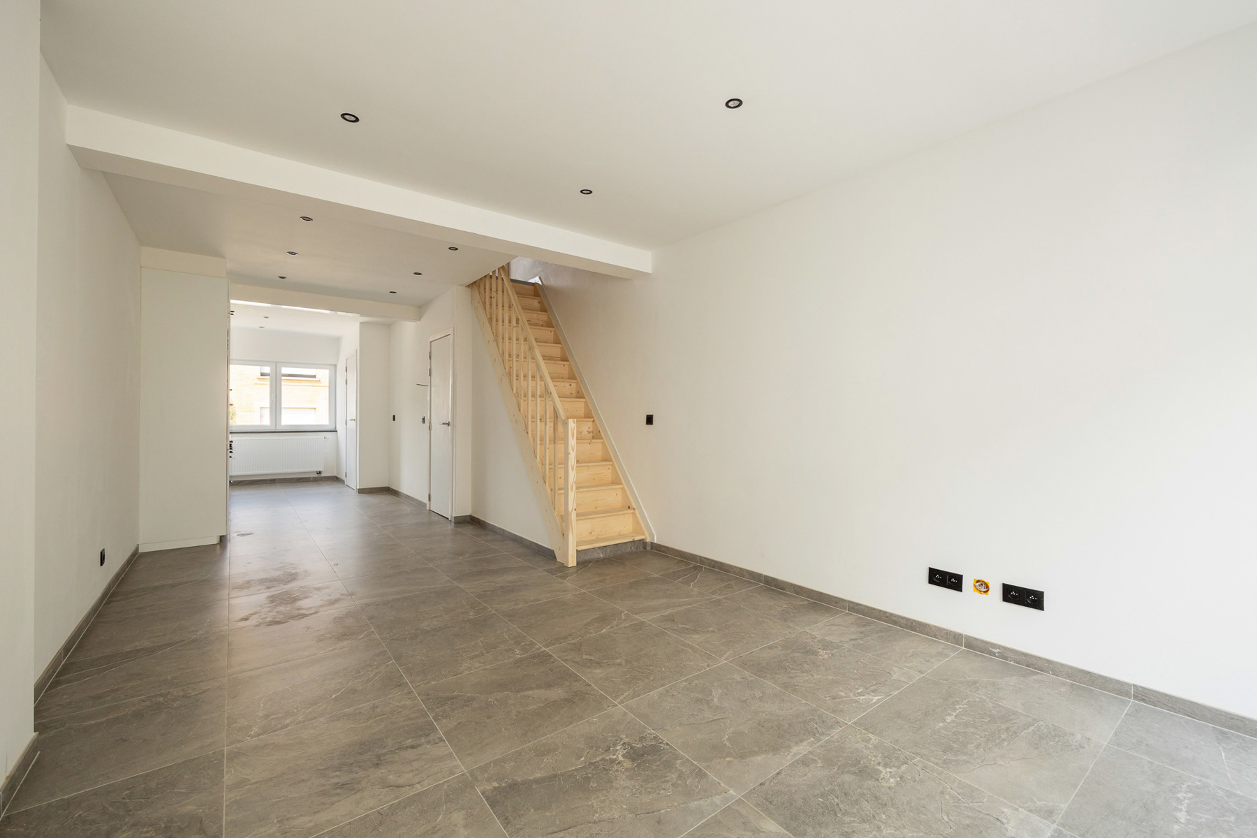 Gelijkvloers: Inkom, gastentoilet, leef/-eetruimte, volledig geïnstalleerde keuken, opbergruimte en toegang tot de tuin.