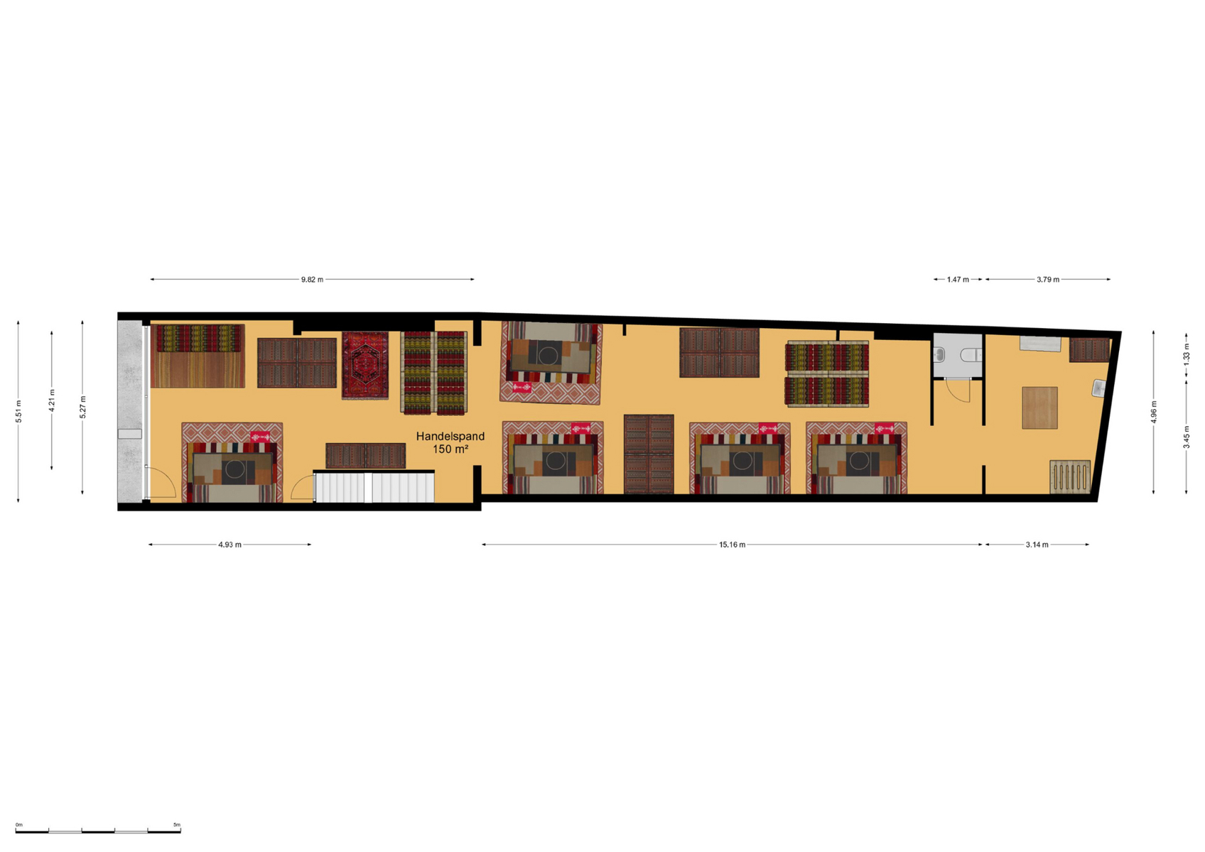 Het gelijkvloers bestaat uit een open, lichtrijke handelsruimte met meerdere lichtkoepels, aparte berging en afzonderlijk toilet – perfect inzetbaar voor diverse commerciële activiteiten.