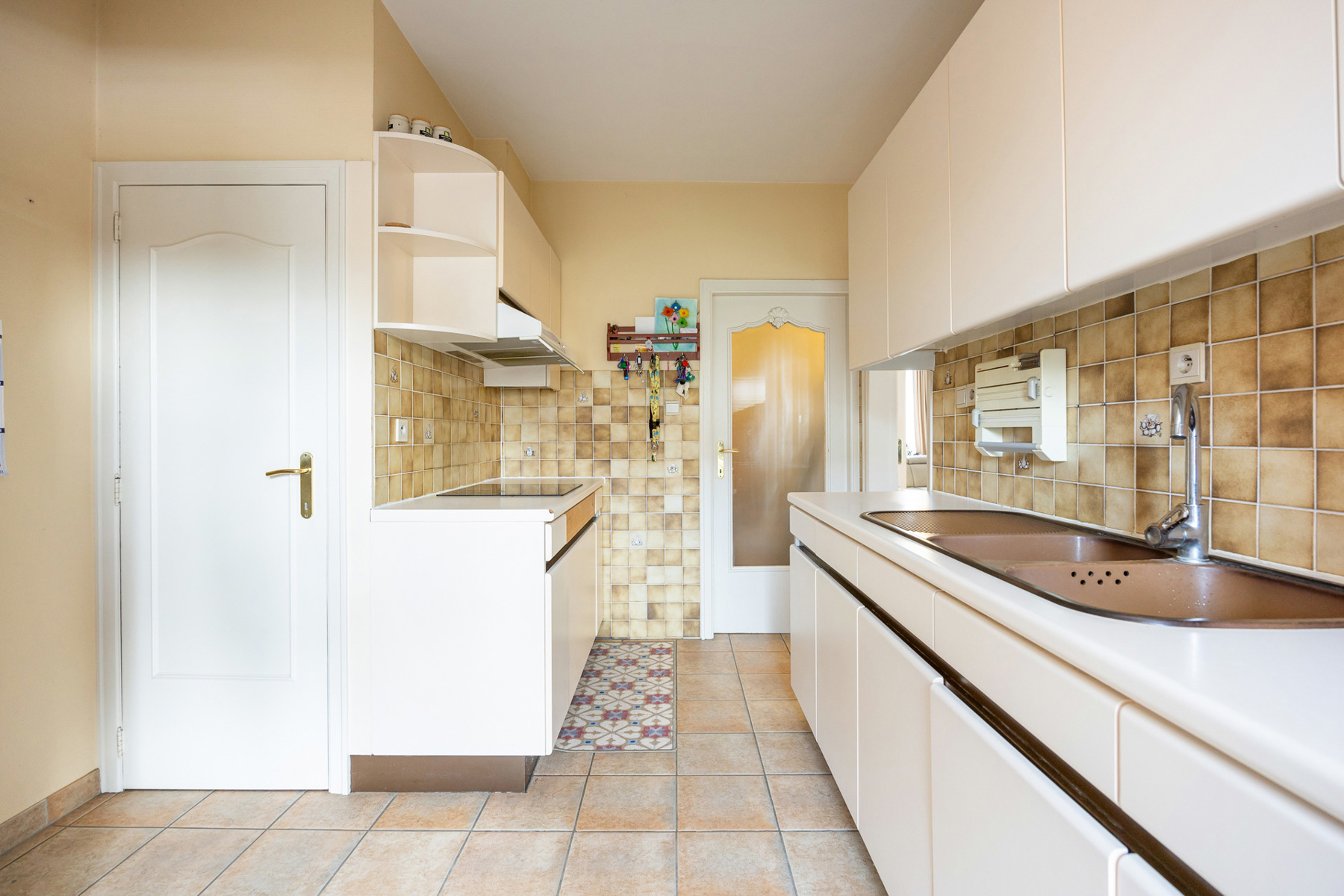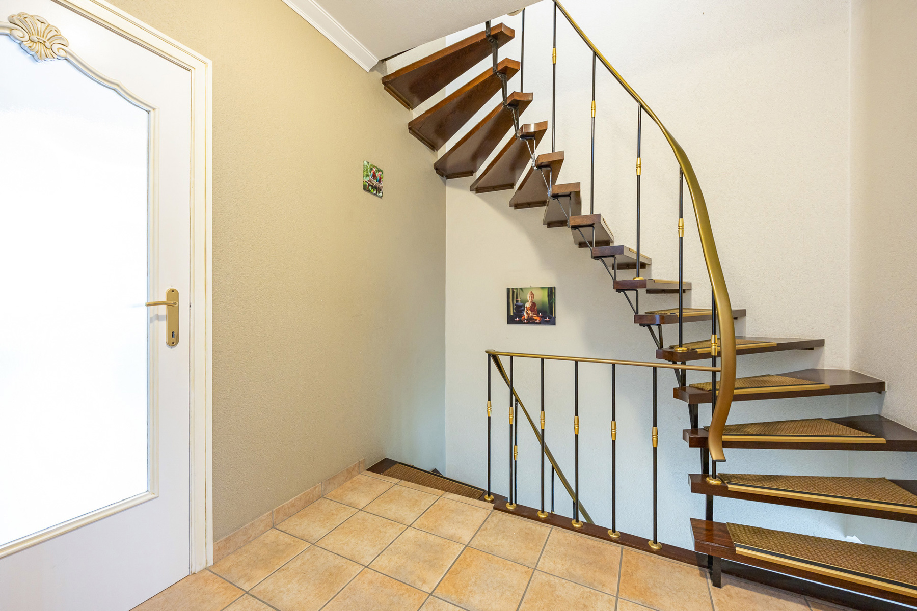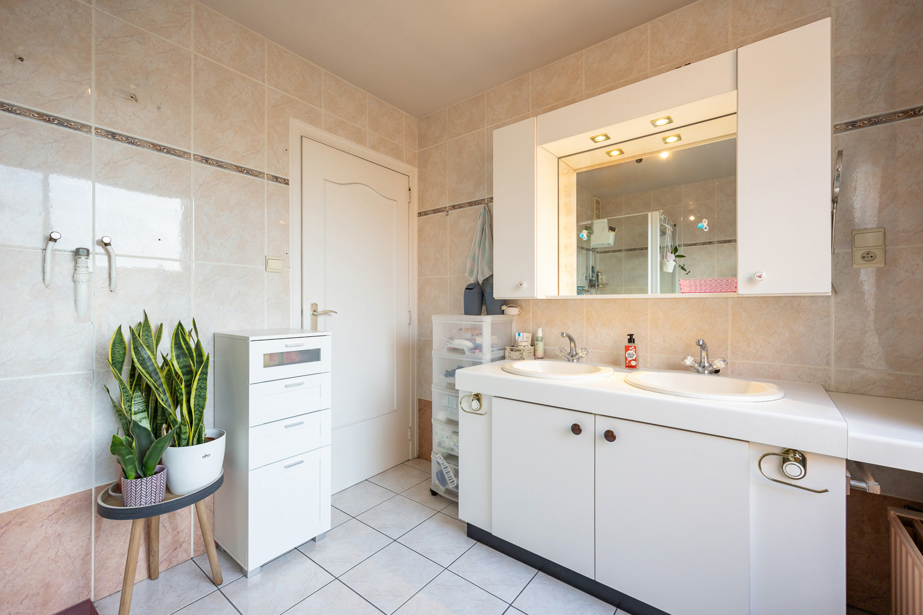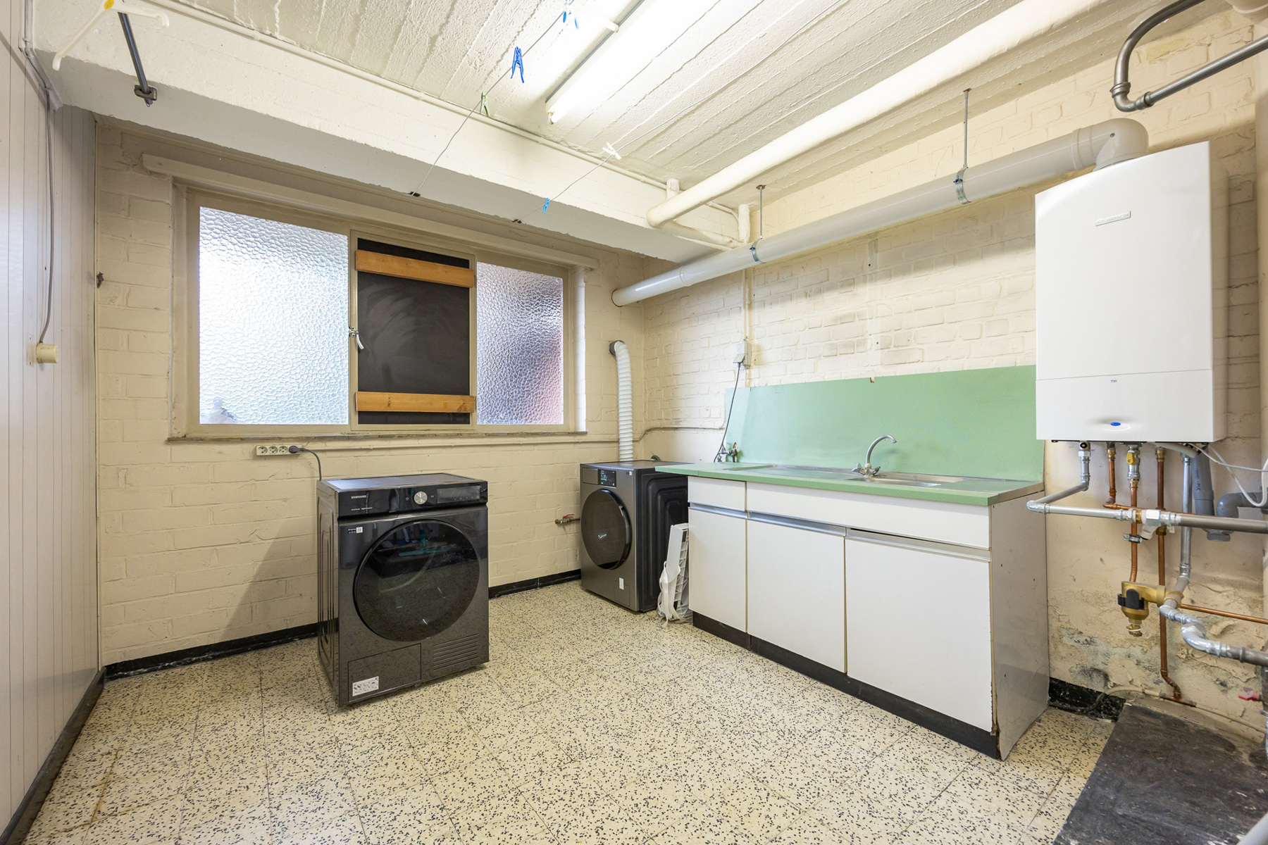Via de inkomhal kom je binnen in een verzorgde en ruime ontvangstruimte met toegang tot de garage en berging. Achteraan bevindt zich een praktische wasplaats en toegang tot de zonnige tuin met terras — ideaal voor ontspanning, speelruimte of zomerse barbecues.